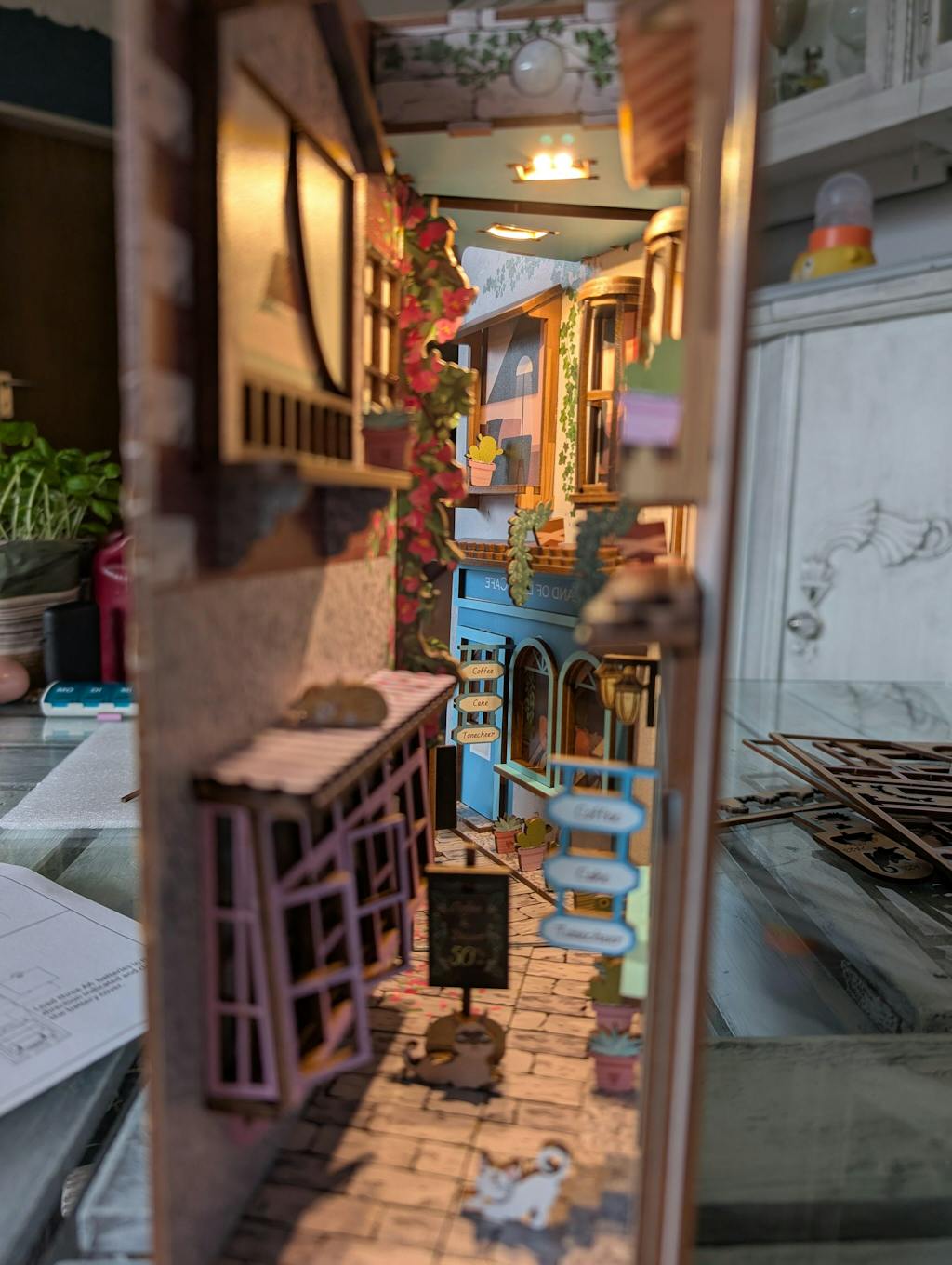 Le kit de coin lecture Tonecheer DIY met en valeur une petite ruelle animée. Le parasol rayé qui s'étend depuis le café d'art confère à la ruelle une atmosphère chaleureuse et romantique. Lorsque la lumière est allumée, une douce lumière jaune illumine la rue, et la présence de quelques adorables chatons accentue encore davantage la douceur et le charme de la rue.