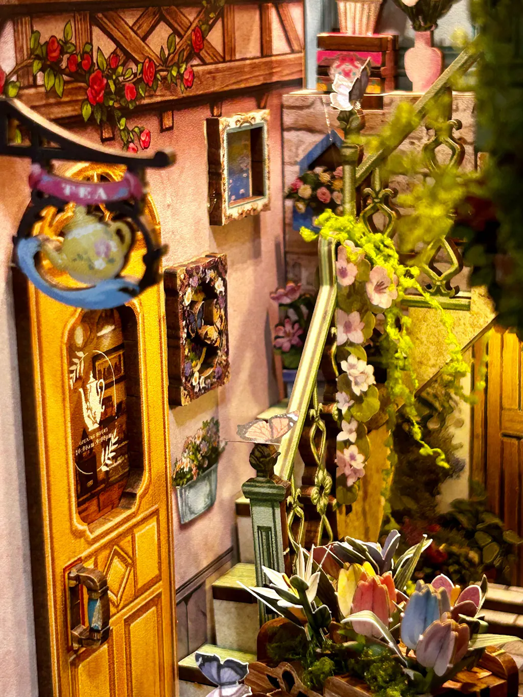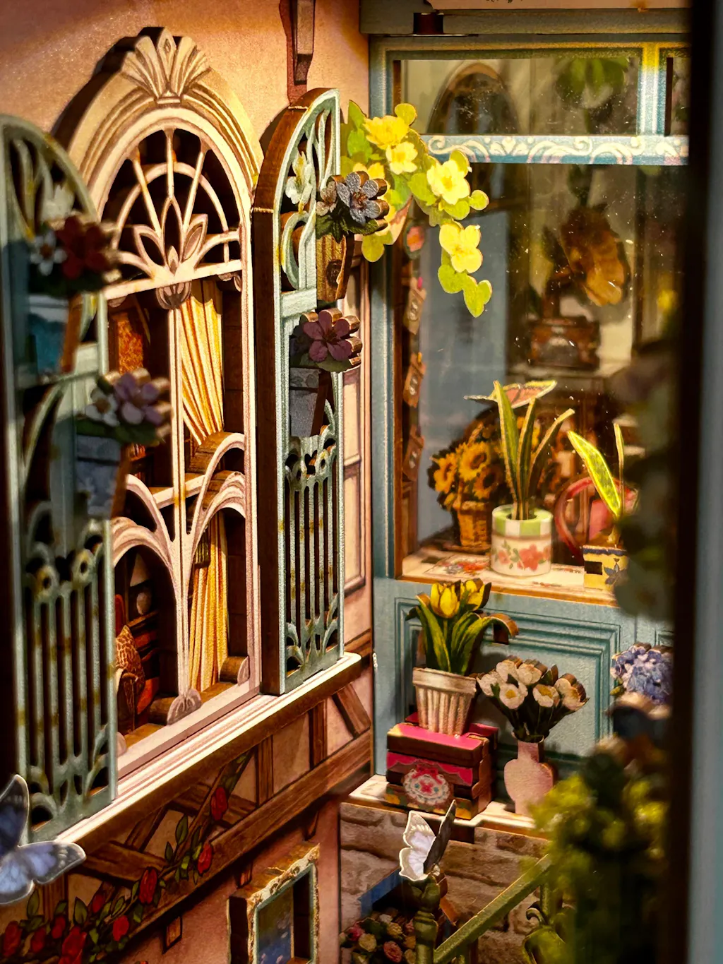 Gather a hint of springtime to craft a lane in full bloom. Stroll through this blossoming alley, open a window to the flowers, and listen as wind chimes drift from the end, trembling in harmony with time itself. This Book Nook Kit 3D puzzle brings the moment to life.