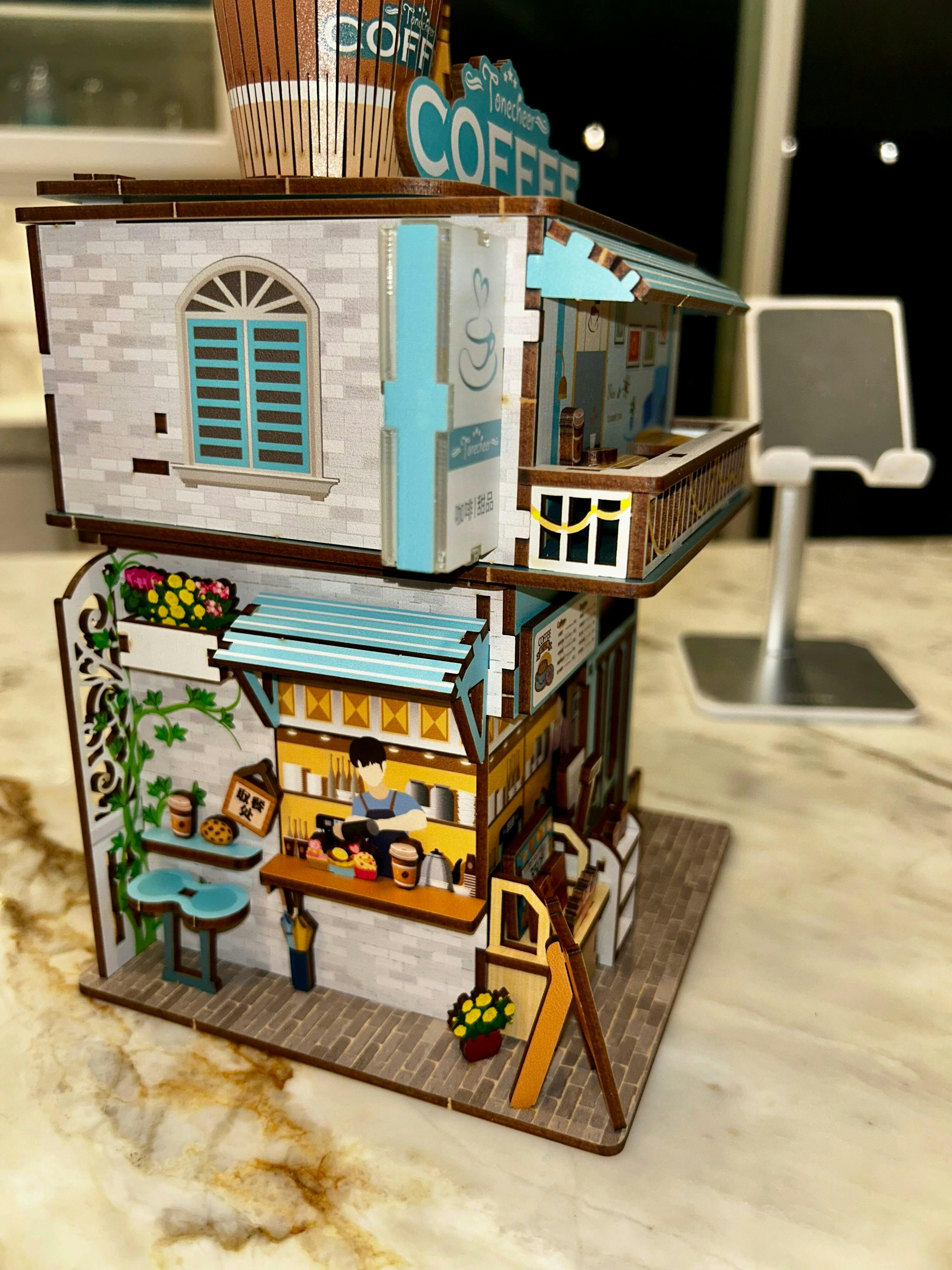The Tonecheer 3D Puzzle DIY miniature storage house kit is ideal for teenagers and adults who have interest in crafting. Capturing a romantic scene of a coffee shop by the sea, this kit brings a touch of romance and creates a comforting space on your desk. The miniature world is exquisitely crafted so you will find it full of interesting details. Some dynamic designs, such as freely operable windows and doors, are waiting for you to explore.